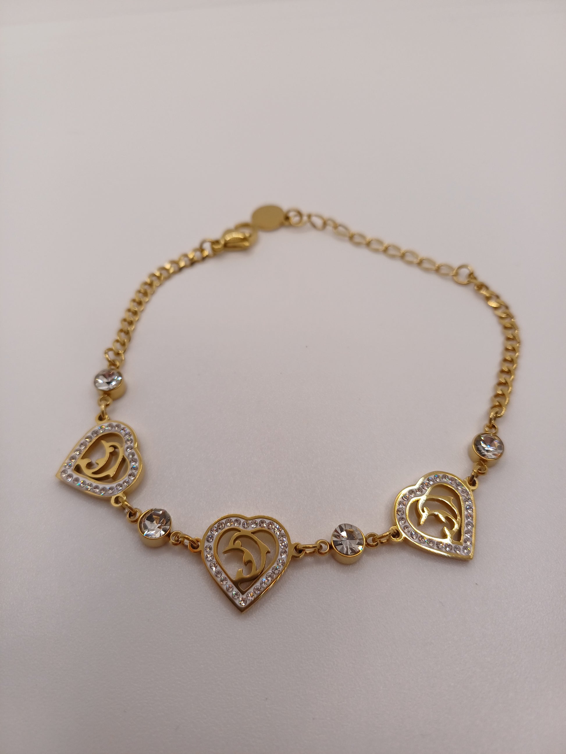 Braccialetto in acciaio inossidabile gold con cuore, delfino e brillantini